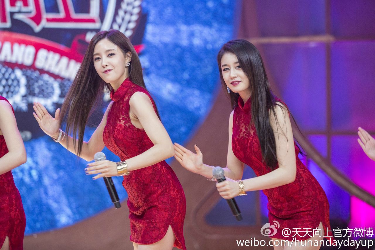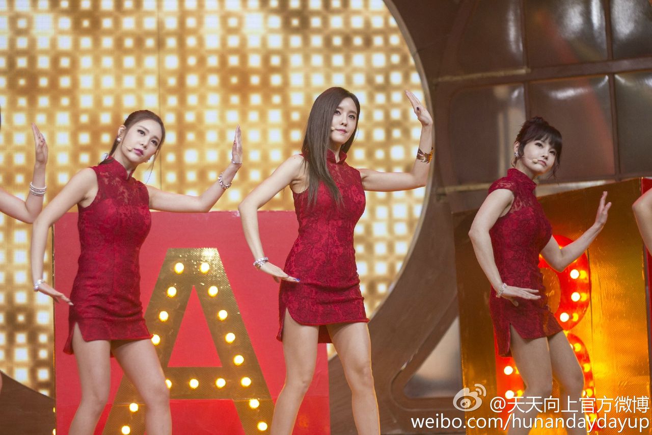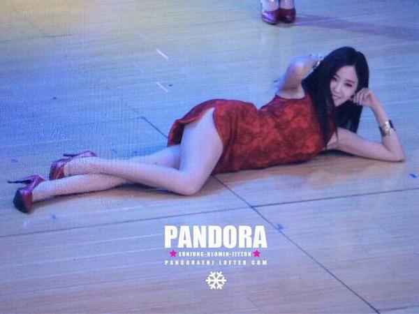 スリットの入ったチャイナ服着て寝そべるT-ARAヒョミン