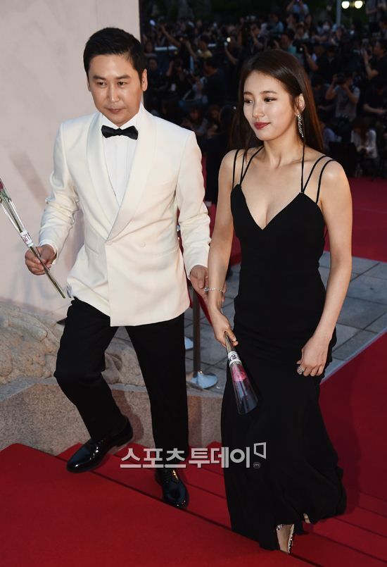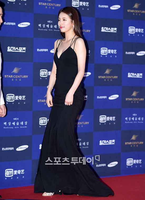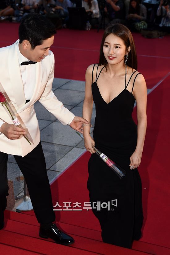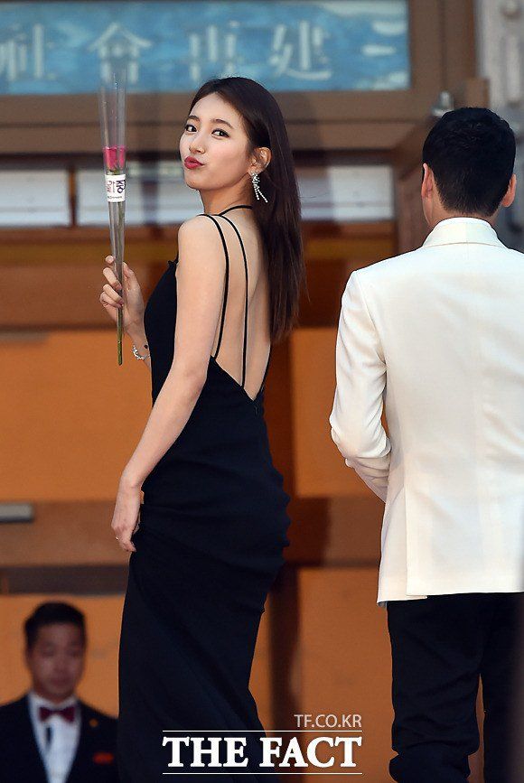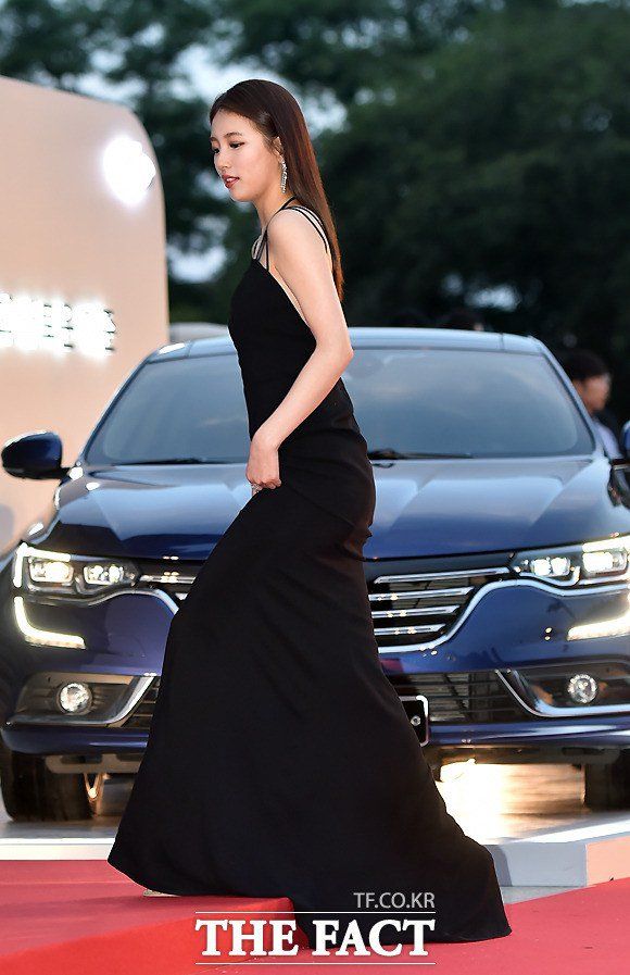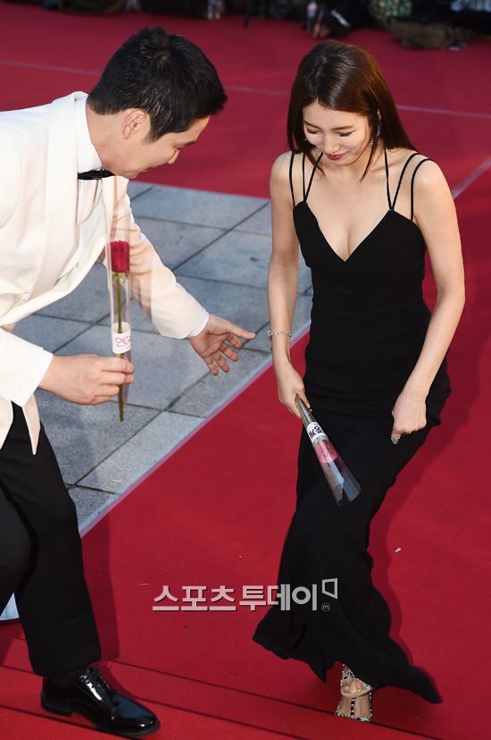 大胆に胸元露出したドレス着てレッドカーペットを歩くMissAスジ